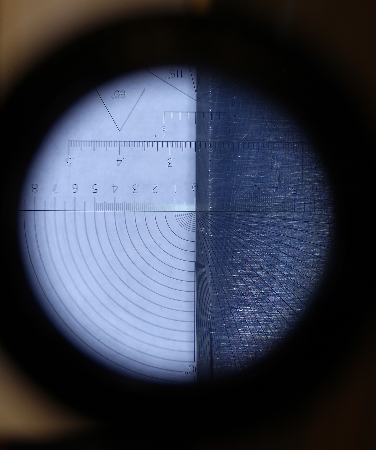 I’ve got a new loupe that I really like because it has a big objective lens and a very nice graticule. After fiddling a lot with the best positioning of the knife, I did some sharpening to establish a bevel and then took pics of the bevel width through the loupe: