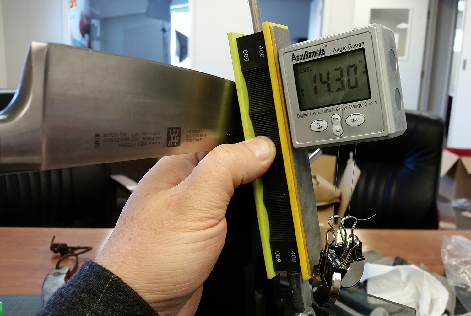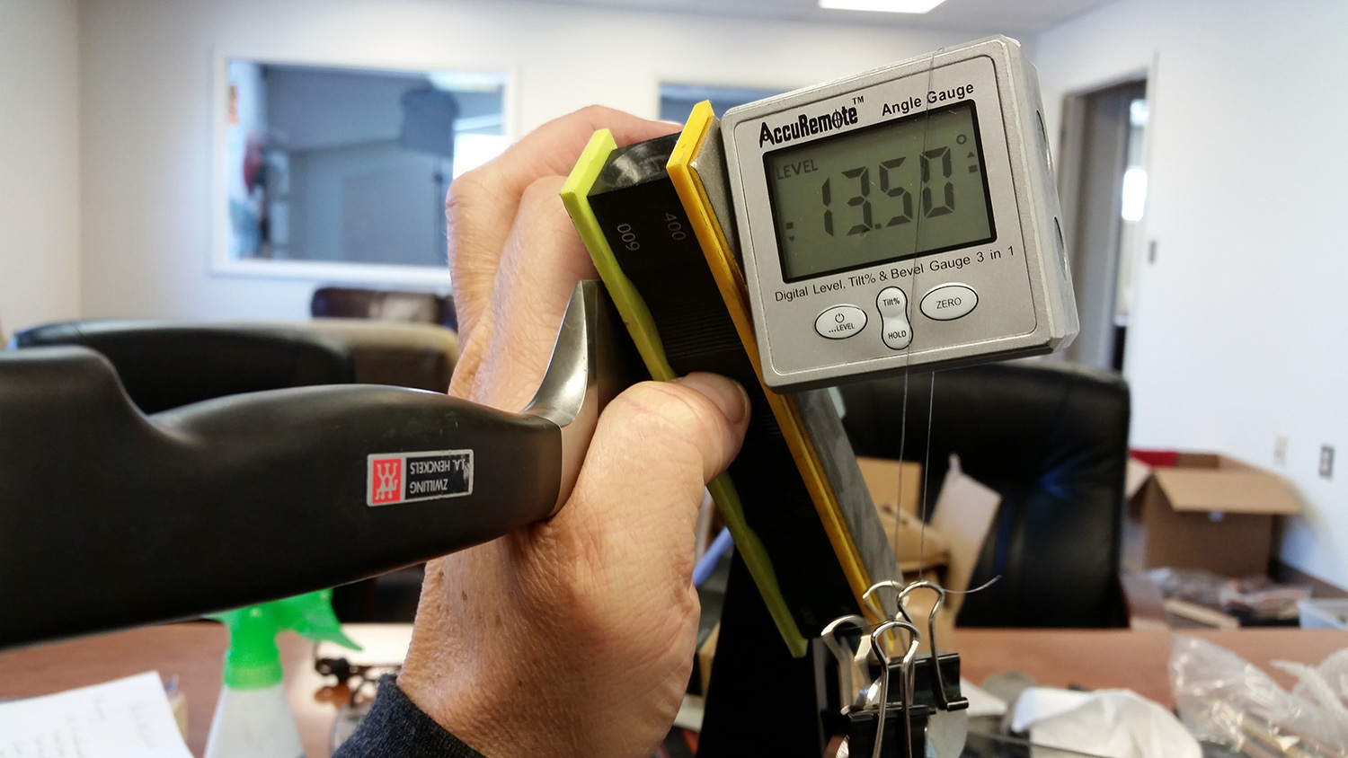B: I rotated the knife to a horizontal position, then measured the bevel at that point which had been directly over the vise.