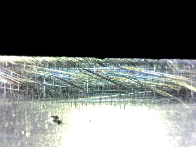 More stuff… On studying the earlier grit photos (100, 200 & 400), you’ll see some big chunks missing along the apex. These are usually caused by 100s and 200s, or by coarse (<400 grit) unbroken-in stones, and mostly by trailing edge strokes. Eduardo must have spent a good bit of effort with his 400s and 600s to clean up that edge. I never use my 100/200 stones unless I’m doing some significant profiling - and even then I try to avoid edge-trailing strokes.
