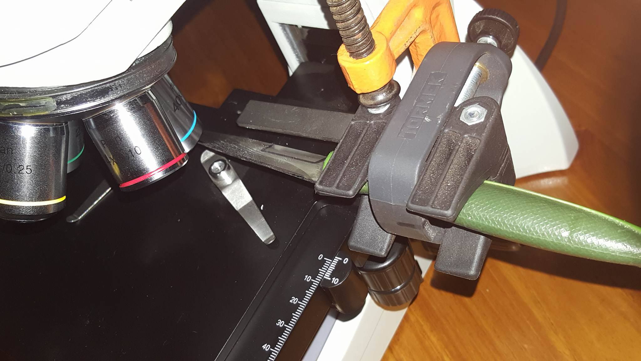 Good Idea on the Tomek Jig Cliff. I am still using play dough to adjust the angle, however, with the blade handle extended out, I am limited to a small section of the blade for now. I am thinking about and saving for Clay’s jig or something like it. Like your scope, I need to be cognizant of the room available under the objective lens. My “Helping Hands” set up is pretty effective when needed (Here).