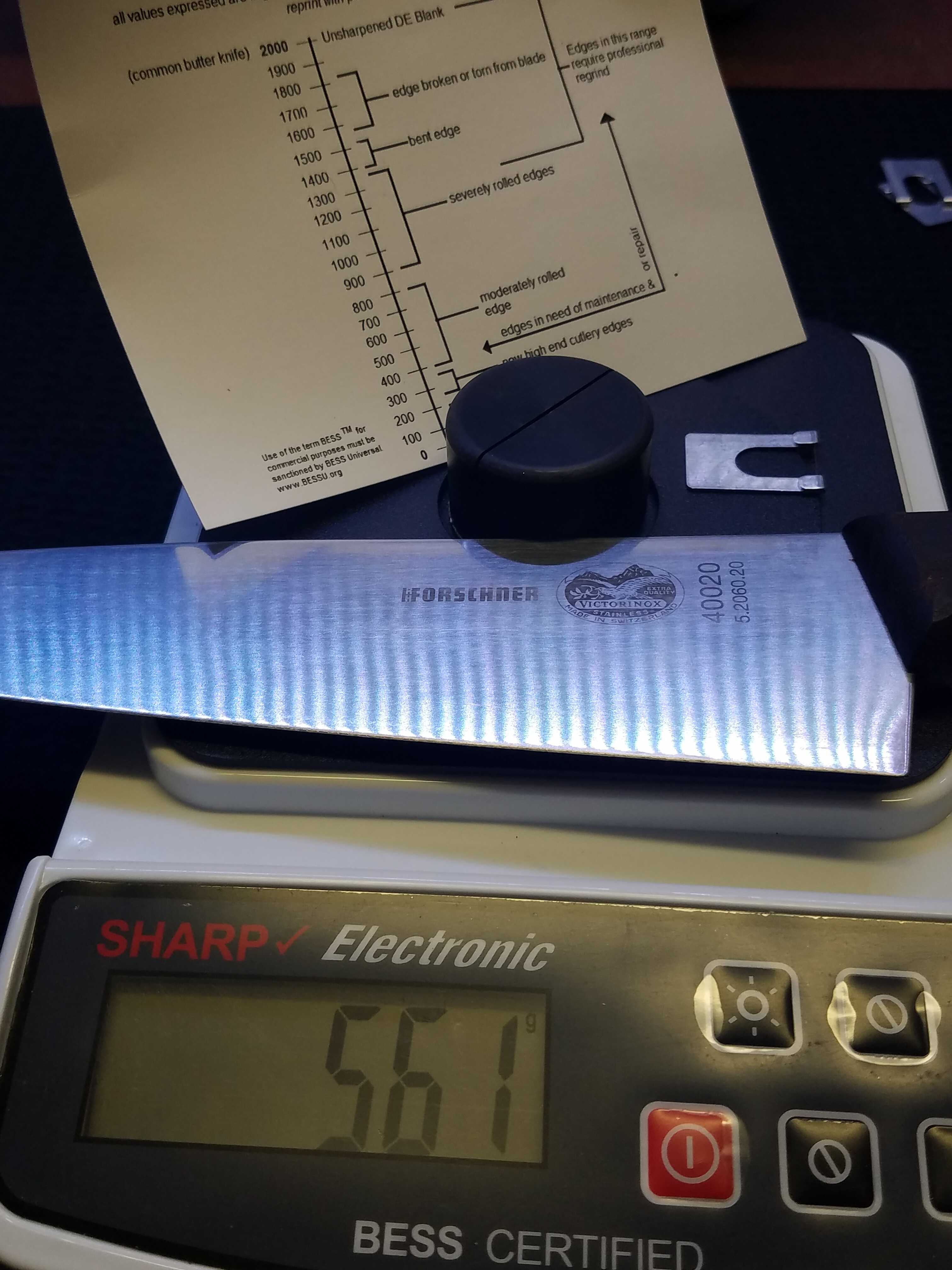 Over the many knives I’ve sharpened, I’ve found that looking straight down at the apex with the microscope tells me when I’m done. If there is no light reflected off the apex, I’m at or better than razor sharp. On the tester, it will show less than 150 and most times => 100 gf. Some knives just won’t be cooperative. My PM2 in S110V still shows a sliver of reflected light and the tester shows 120-160.