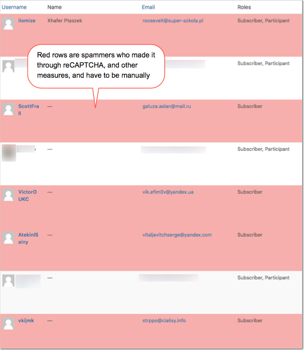 I thought I would share my reply below, and also add a bit data about how frequent the issue of spammers is. In other words, we don’t take it lightly that the reCAPTCHA can be a massive pain in donkey, but overall it has been very effective. On some days, we have more than 100 attempted spam signups. Many of these are ‘robots’ (automated scripts that try again every day) but that doesn’t lessen their impact when they’re successful, as they’re programmed to immediately post spam messages.