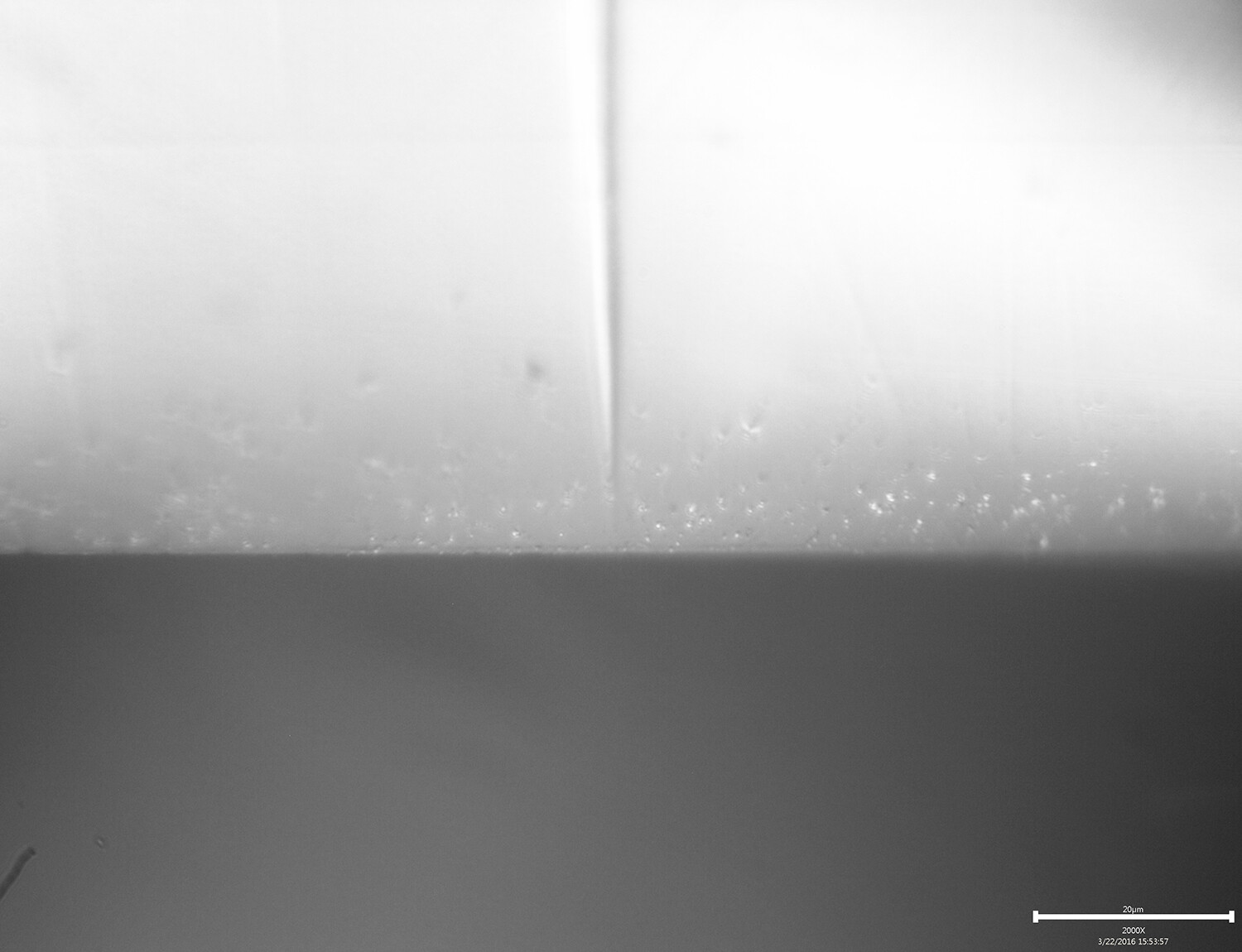 Clay has been showing us microphotos in sets of three; the edge, the bevel and the shoulder. The intent being to better understand the effects of the abrasive across the entire width of the bevel. In this case, he’s showing us a photo of an edge he had polished out to a high degree, but then he noticed a scratch and decided to take photos of that scratch as his 2000X 'scope moved away from the edge. It might have been less confusing if the photos had been inverted.