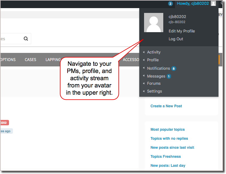 In the menu, you may notice that we eliminated the link that used to be there for ‘My Private Messages.’ This is because the PMs now live on your profile page, and it’s not possible to provide a separate link straight to PMs.