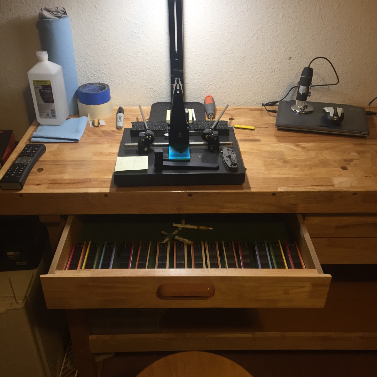 Hey there! Ordered my WE about a month ago after sharpening on an EP for a few months. Upgraded my pro pack 1 with quartz base with with the gen III vice and arms. Here is my setup. Going to post my first my best to date mirror edge in the super polished edges thread next.