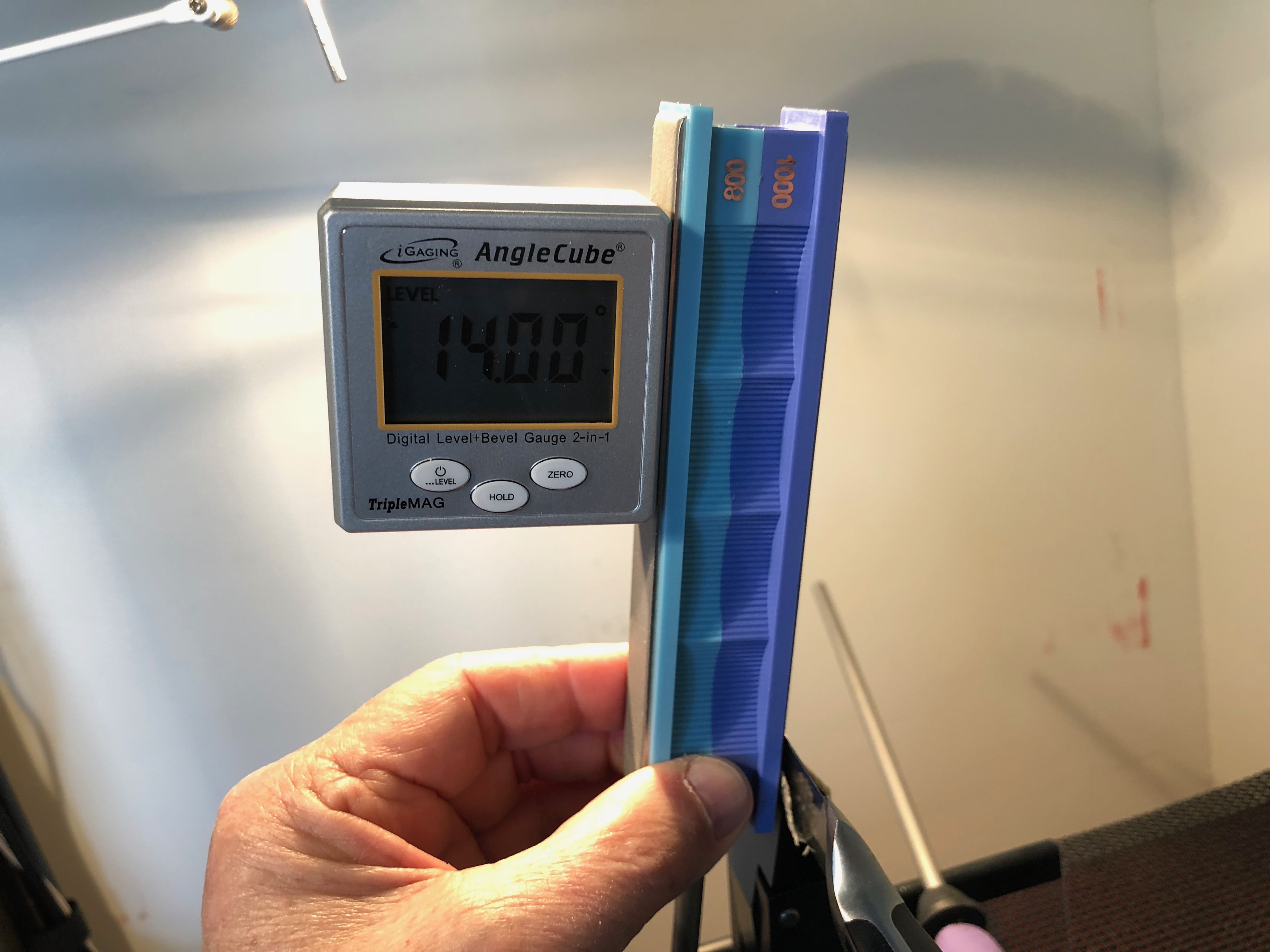 I had to move the indicator all the way back to a reading of 20 degrees in order for the angle cube to read 14. Am I on the right track to have to keep it on 20 degrees to get an angle of 14 with this thin small blade. My 1500 grit stone also came today so I went back over this knife for awhile with the angle cube reading it 14 degrees.