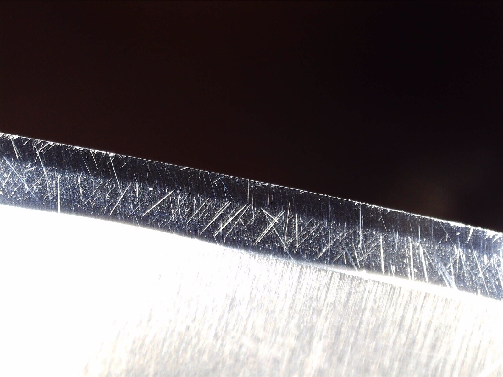 Used the low angle adapter to reach the 15 degrees per side and micro adjusted each arm to 15deg. I Used an angle cube to dial in 15.00 deg. ± .05. I used a sharpie to validate that indeed the 15 dps was "spot on and it was really close so I ran with it. Although I started with 1000, it was WAY to slow to get me going so I decided to back off grit by grit but wound up down at 100 grit diamonds to “re-profile”. Then 200, 400, 600, 800, 1000, 1500, 2200, 3000. Each grit I used a combo of leading and trailing edge strokes, but mostly tried to do edge-leading as I was noticing tear-out on the USB scope.