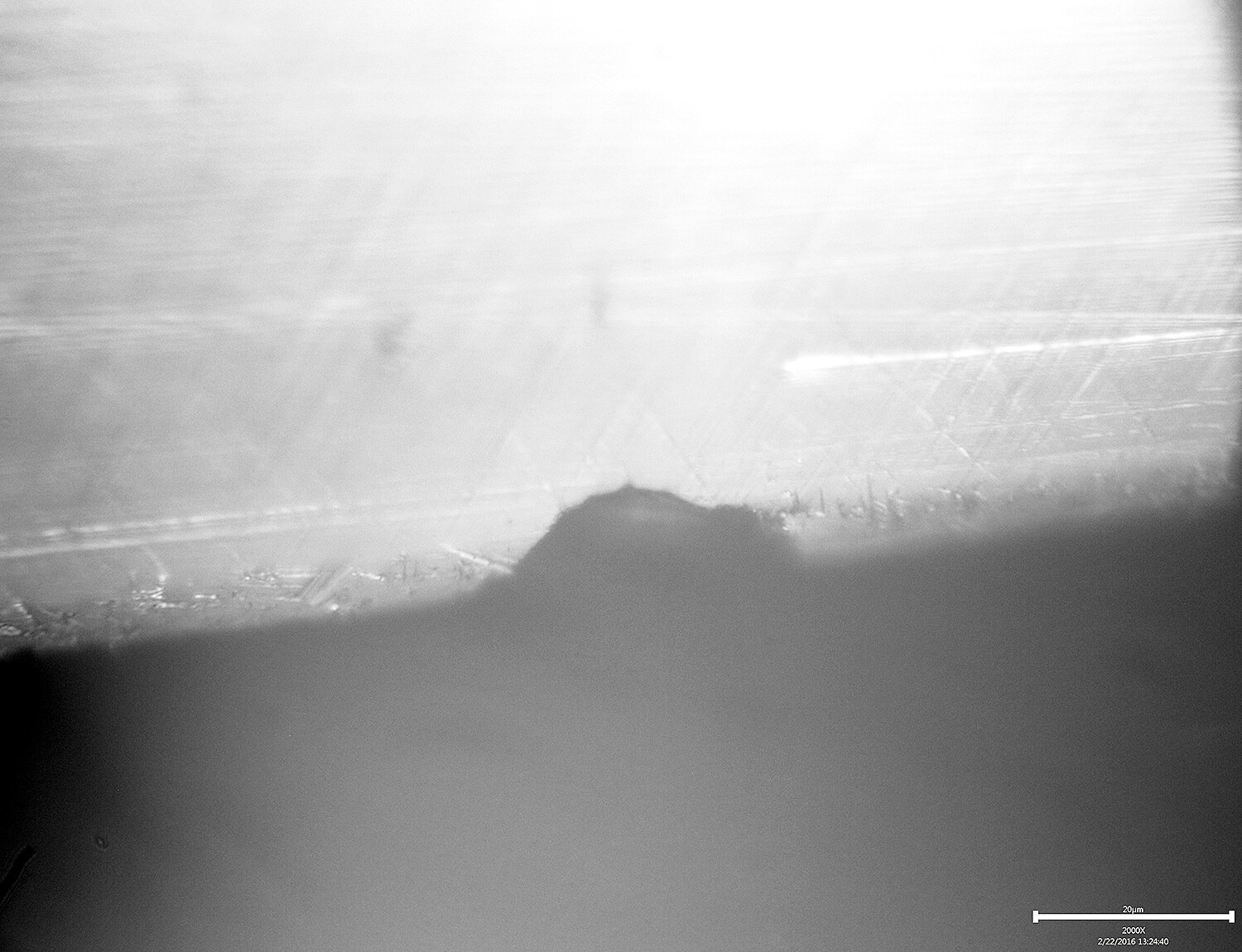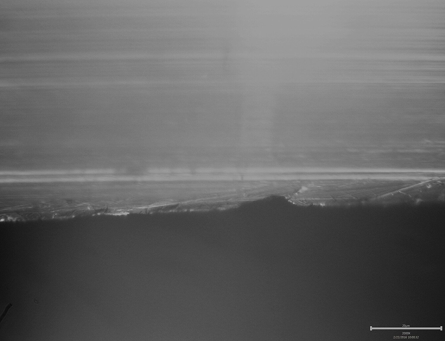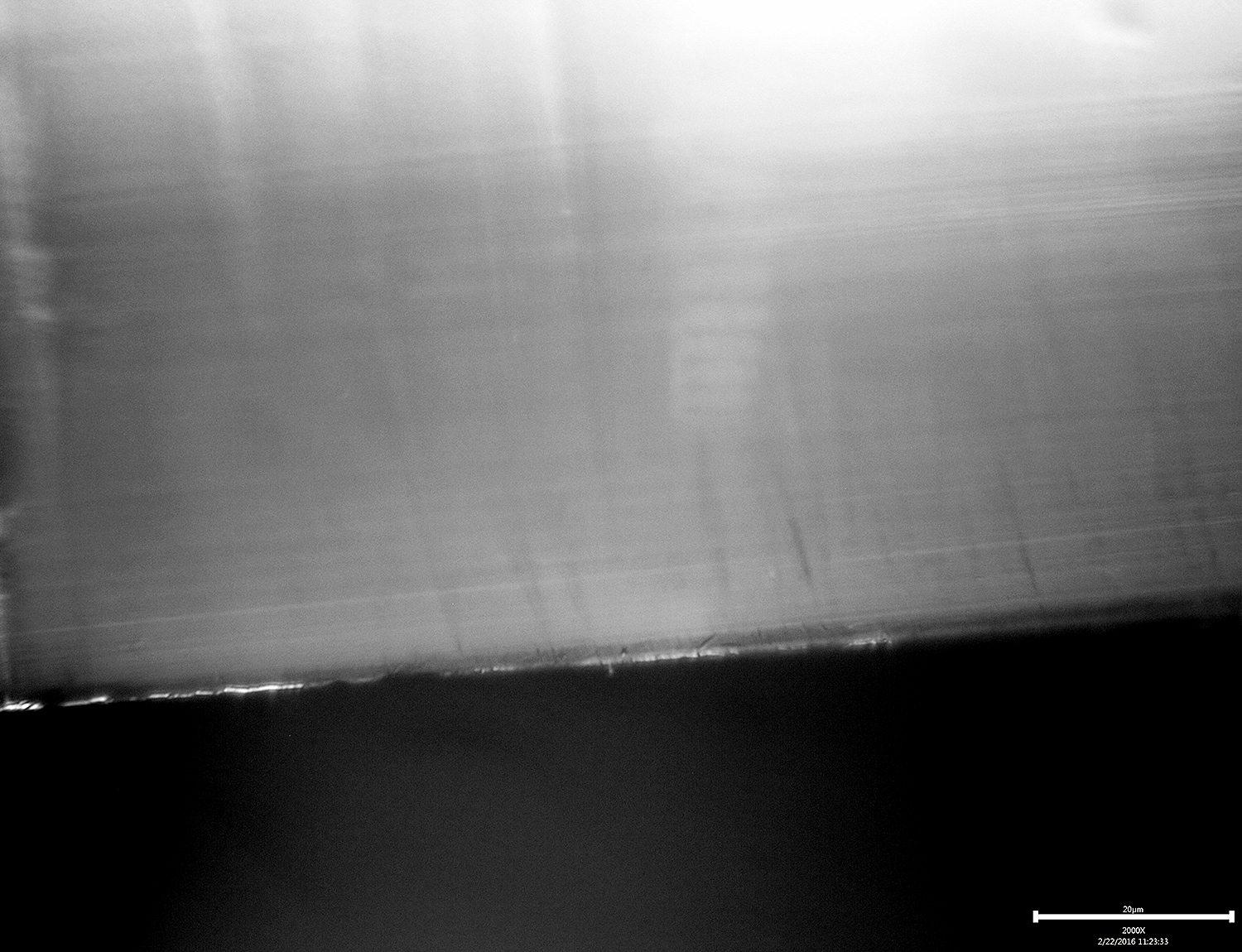 I’ve been struggling to duplicate the edge sharpness with the horizontal stroke. It seemed that the edges I was creating with that technique were pretty dull, not even shaving sharp. To investigate, I rebuilt the bevel on the blade I was using last week and finished it down to .1 microns with lapping film, all with horizontal strokes and I was able to get a somewhat decent image at 2000x. The image explains why the blade was barely shaving, even at 15 degrees per side: