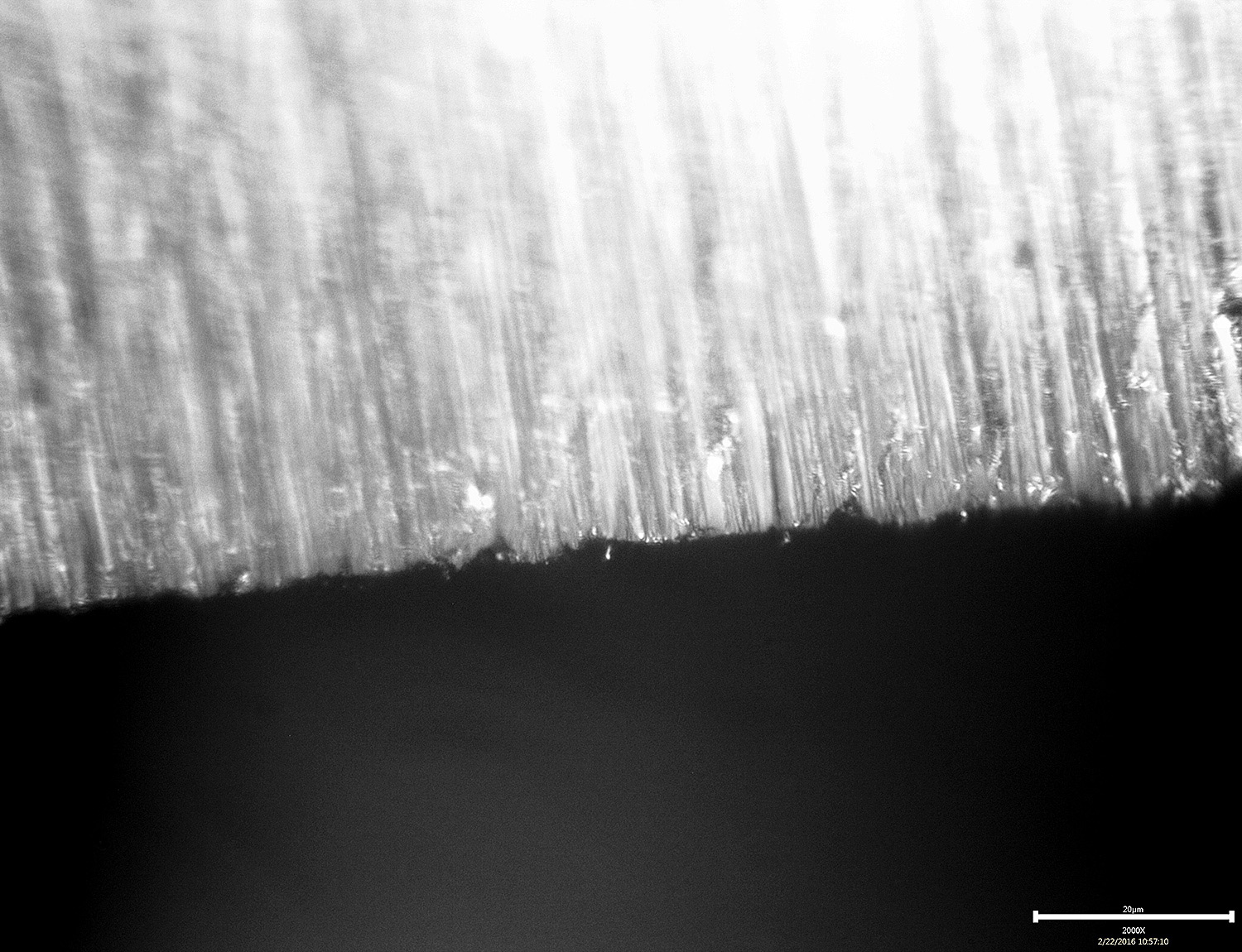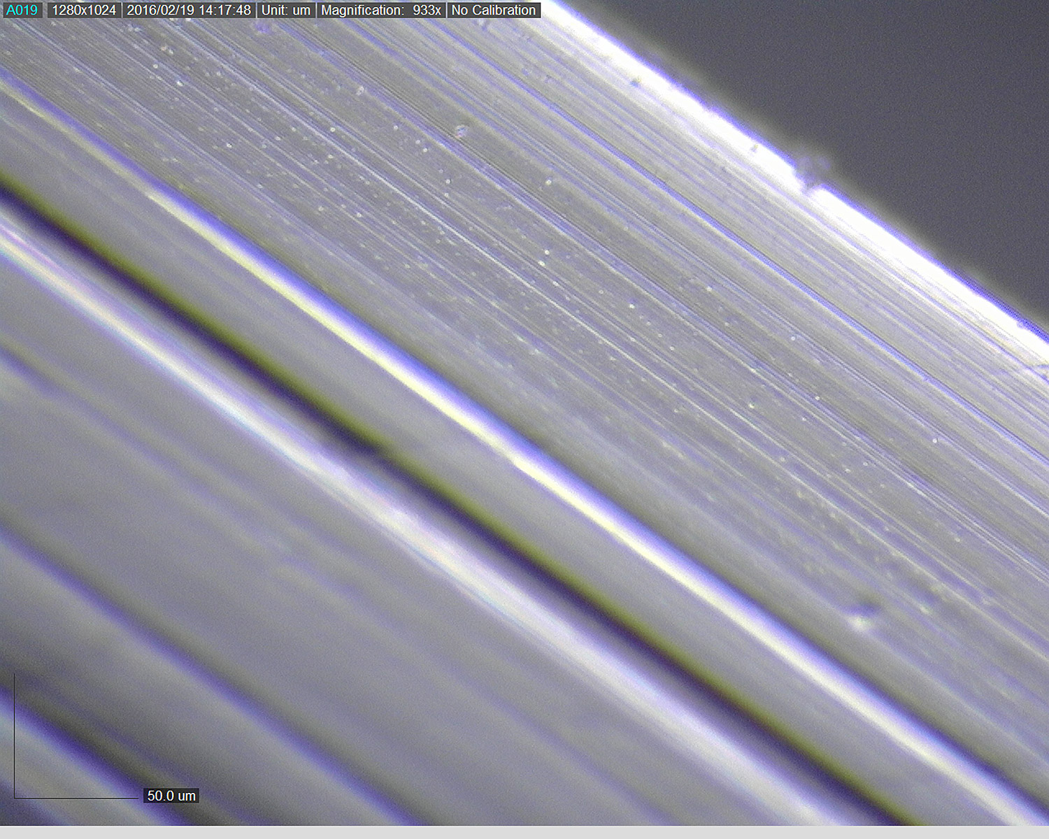 I’m pretty certain it’s not breakout from the 1000# stones. I rebuilt the edge a number of times and looked at it at each stage of each iteration and I only saw the breakout like that when I went all the way to the edge with the edge-parallel strokes. I’ll see what I can do about looking at it edge on. The depth of field at the higher magnification is pretty poor, so all you see is one small portion of it but I might be able to look at 230x or maybe 500x and get some measurement. I think though that kind of job is really more for the SEM level. Todd Simpson is the guy you’re thinking of. It would be interesting to prepare some samples and send them off to him. If you guys want to suggest a few, like maybe 4-6 preparations, I could set them up and send them his way to examine. As far as polish goes, the edge-parallel (maybe lateral is a better term) technique looks great at low magnification and to the naked eye, just the opposite of a highly stropped edge which looks great at high magnification but not as good at low ranges. One thing that I keep coming back to is that the edge isn’t very sharp for me when I’ve used the lateral technique, barely shaving even at 15 degrees and .1 microns. I can take an edge that I’ve prepared with perpendicular or diagonal strokes that’s easily whittling hairs and do the lateral technique until all marks are gone and end up with an edge that won’t shave at all. Weird. Then, looking under the microscope, I see the big tear outs and it seems clear that something about the process is beating up the edge. I’m trying to picture the forces involved as the stone slides along and I’m not sure yet how it compares to the forces with other stroke directions. Maybe tomorrow I’ll prepare an edge the traditional way with a very smooth scratch pattern up to the edge and then I’ll work laterally, a little lower than the final angle and try to creep up on the edge to see when the tear out happens, if it happens at all. I could take a few images as I progress so we can be sure that the tear outs aren’t present before the lateral strokes. Or, I could just start on the edge right away and see what happens. Since I’m clearly rambling now, I’ll hang it up for the night and go play some racquetball.