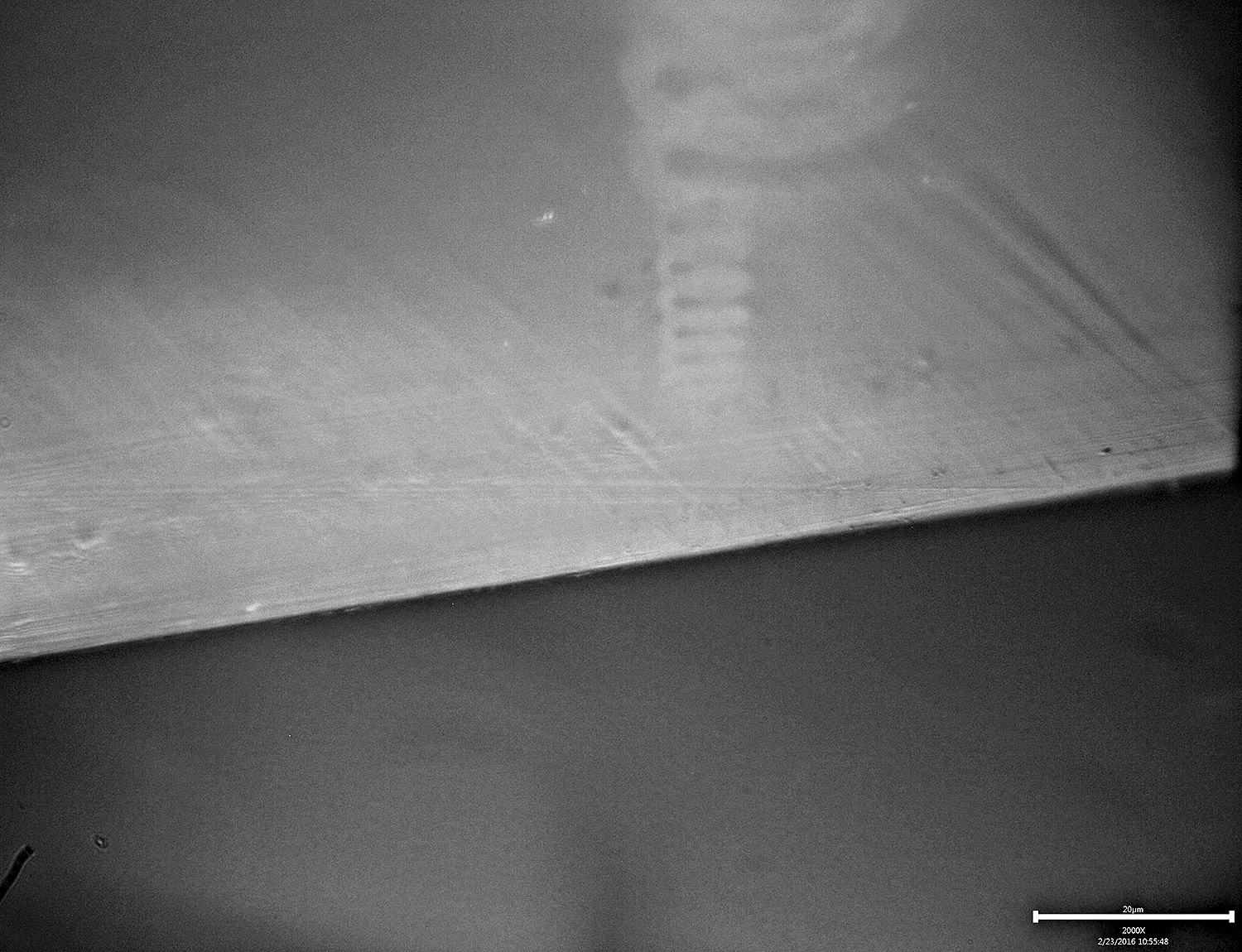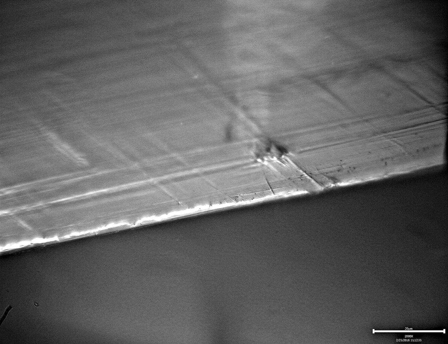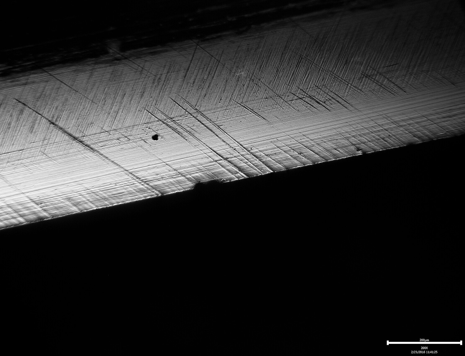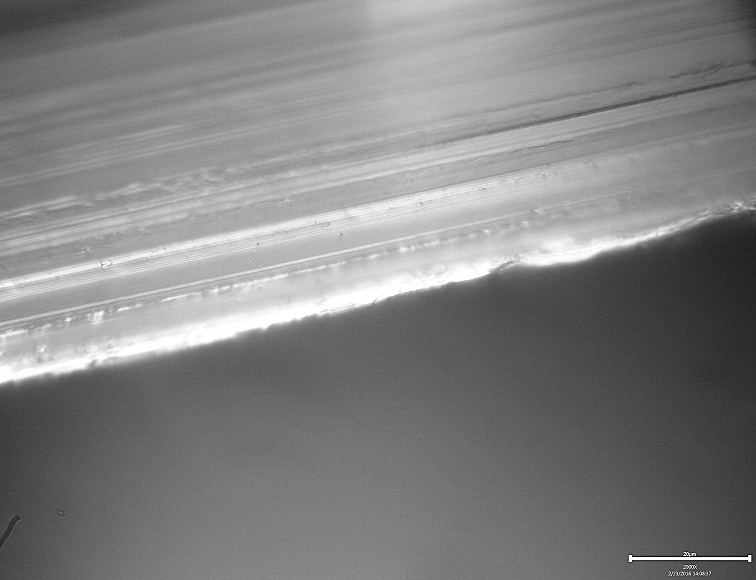 I decided to image the edge when stroked parallel to the edge with a coarser grit. I chose 400# and then I took three images with different focal lengths to try and get a composite with more depth of field. I stacked the images in Photoshop to create the composite: