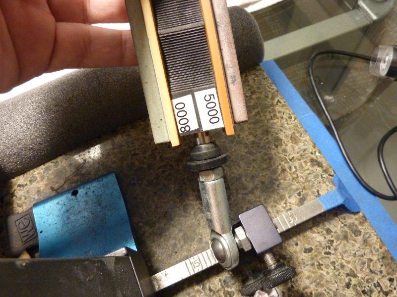 OK now we’re cooking with gas! Some knives, like Benchmades, have unusual grinds that can make them difficult to clamp straight and some of them just won’t. You have to use chamois or moleskin or something like that so you can grip the blade with a very small area. If you simply can’t get the knife to set perfectly vertical then you have to adjust for the cant. Sitting behind the knife clamped, if the blade leans to the right move the right adjustment in a deg. or 2 and the left adjustment out the same. Then pay close attention as you scrub in or start sharpening and move the adjusters to where you need them to even the bevel. Also you can clamp some of these knives so the blade will move side to side, caused by the contact area hitting a high spot on the blade with nothing below or above the contact point. Clamping the knife securely is paramount for results and chamois or moleskin will help with that.