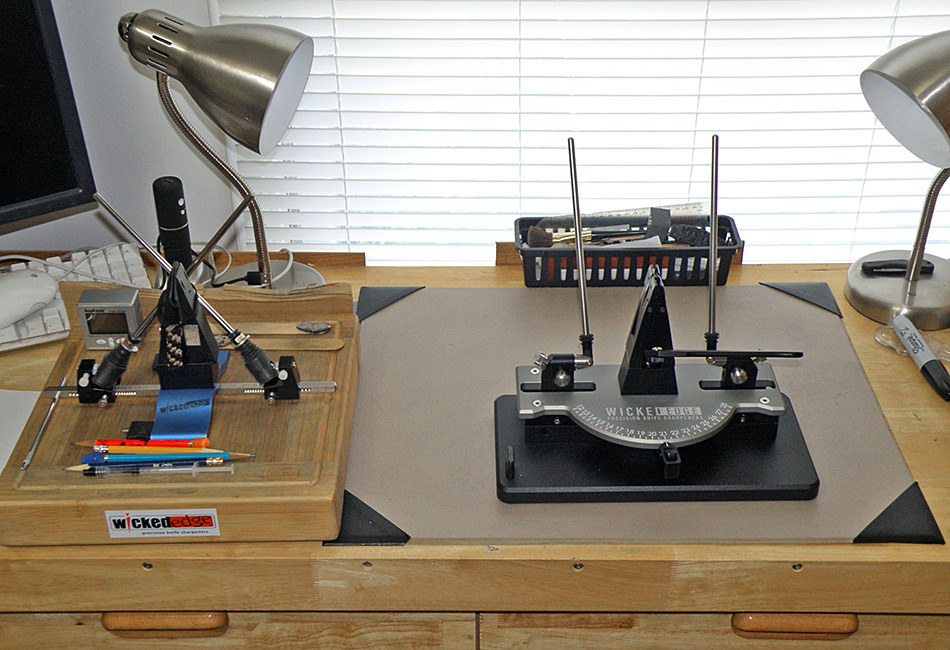 Outstanding results in far less time. Is the Gen3 perfect … no. Do I regret adding it … absolutely not. For me, the biggest deficiency is the fact that it is difficult, if not impossible, to use for some of my knives with very short and/or very thin (width not stock thickness). It is just too difficult to get good clamping on a knife like this. You could use a small knife device like the Tormek (which I have and really don’t much care for). I prefer to use my old WE 2 for those knives … which is why I did not just upgrade the 2 to a Gen3. Keeping both systems lets me handle every knife in my collection. Here is a pic of my workbench sharpening station: