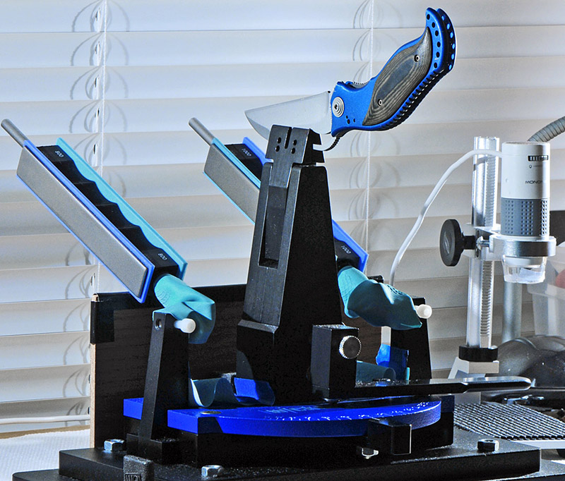 Eventually, I upgraded the WE 100 platform to essentially a ProPac 2 by adding the ball-joint arms, new vice and base rod. I found that this set-up was perfect for me to start achieving very nice mirrored edge bevels as the ball joints eliminated just about all of the (minimal) play experienced with the original arms/collars. This set up could/can handle just about any knife you can throw at it. I was soon tackling knives with compound grinds, huge bellies, and even mirror polishing some relatively expensive knives.