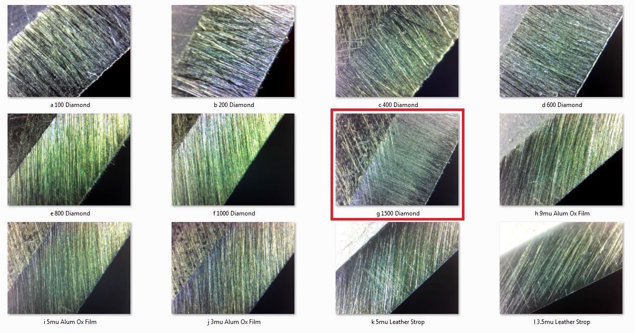 I’ve done about 20 kitchen knives using my 1500 diamonds. It is my favorite. I did a composite a while back with my $35 USB scope. IMO, after 1500 you get into diminishing returns unless you are going for the mirror edge.