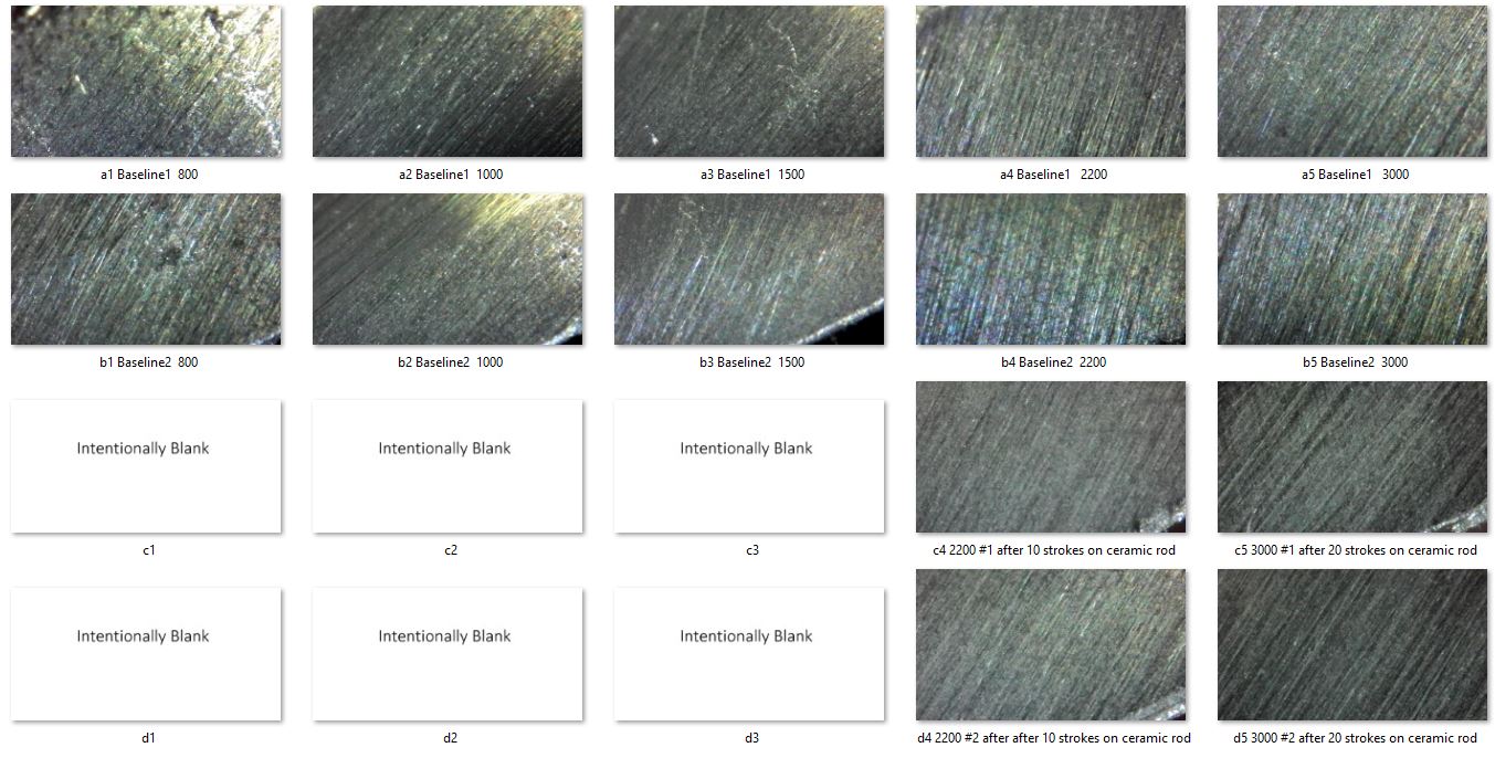 TC, I took your advice and about the glass although I could not find a good piece so I use my white ceramic Messermeister rod (supposedly around 1200 grit but I feel that ceramics don’t follow the scratch grit thing well at all). Anyway, I did another composite below showing 2 rows of Baseline scratch patterns on a cheap knife (800 thru 3000), then I did 10 strokes on the ceramic rod for the 2200 and 20 strokes for the 3000. I did both paddles for consistency. Used medium pressure. I could definitely feel the difference with my finger as well as while sharpening. I did more strokes on the 3000 because my pics at 10 strokes looked and felt like the 3000 needed more (I took over 50 pics). I was also worried about damaging the diamond paddles on the ceramic rod so I started slow but I think I found my sweet spot.