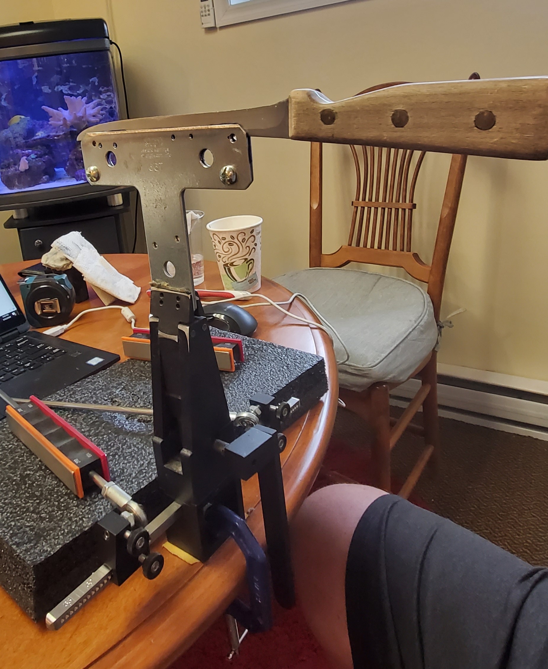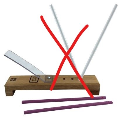 I’ve been thinking about the free hand touch up challenge especially in the kitchen. In lieu of setting up our WEPS (inconvenient at best) for a few passes, I use a ceramic rod which under the scope gives our gorgeous WEPS bevel no love; it’s sharper but the WEPS bevel is on its way out (and a steel is much worse). There are other options to get an edge but none of them seem to last nor be as sharp as it was coming out of the WEPS. Its the same root cause that WEPS solved – some form of fixturing to minimize the various variabilities. The Spyder approach is interesting but expecting someone to hold a knife exactly vertical over a full knife edge to fully sharpen (not just touch up) is nuts. Plus the grit selection is for the birds. You might as well go freehand and develop your ability to feel that you are riding the bevel exactly. Anyway here is my idea: