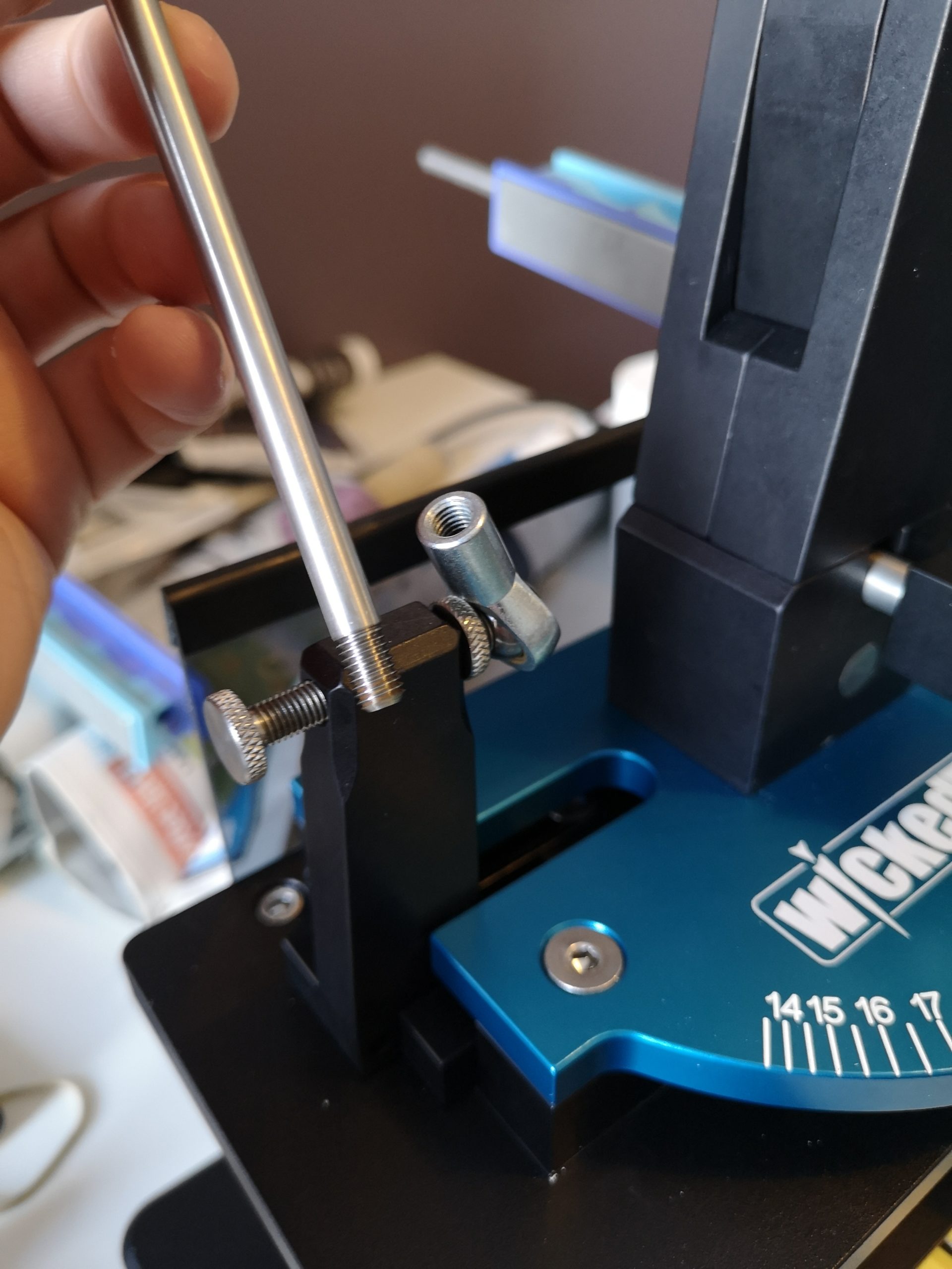 The only time I use the angle guide on the WEPS is when I’ve used a Sharpie on the edge and am trying to find the angle of the blade, I can adjust the angle back and forth at 0.5 degree increments until I find it. The rest of the time, I’m using my angle cube, not a big deal.