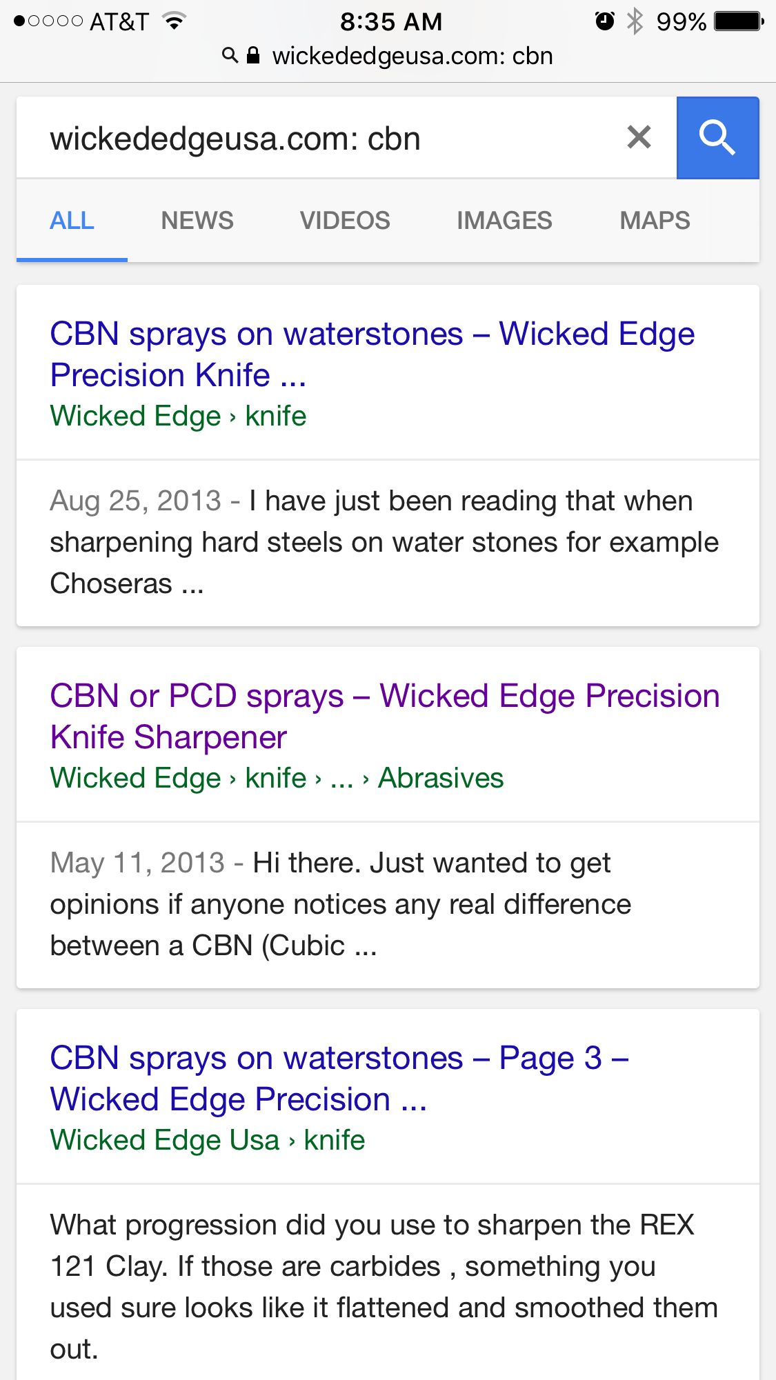 It might be that the procedure for using the advanced search is too complicated. I tried a regular search for “cbn” and came up with a number of results. When I tried the same search on the advanced search page and listed “Advanced Techniques and Sharpening Strategies” as the forum, nothing came up. It wasn’t until I then also added “Need Help with Basics of Using Lapping Film” that I then got a filtered result listing only posts that fit the criteria.