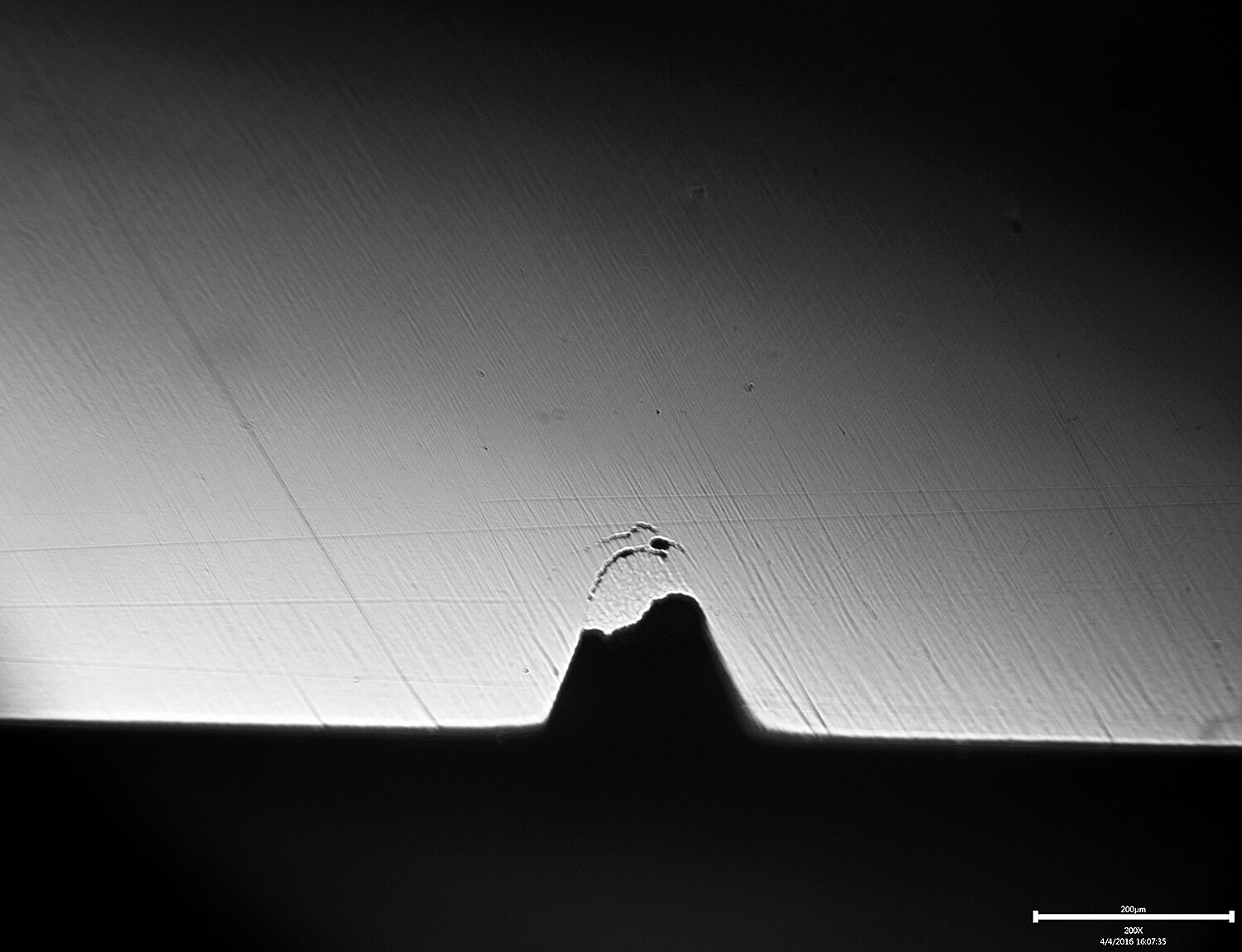 Again at 2000x. You can clearly see fracturing of the steel above the area where the large chip is removed.