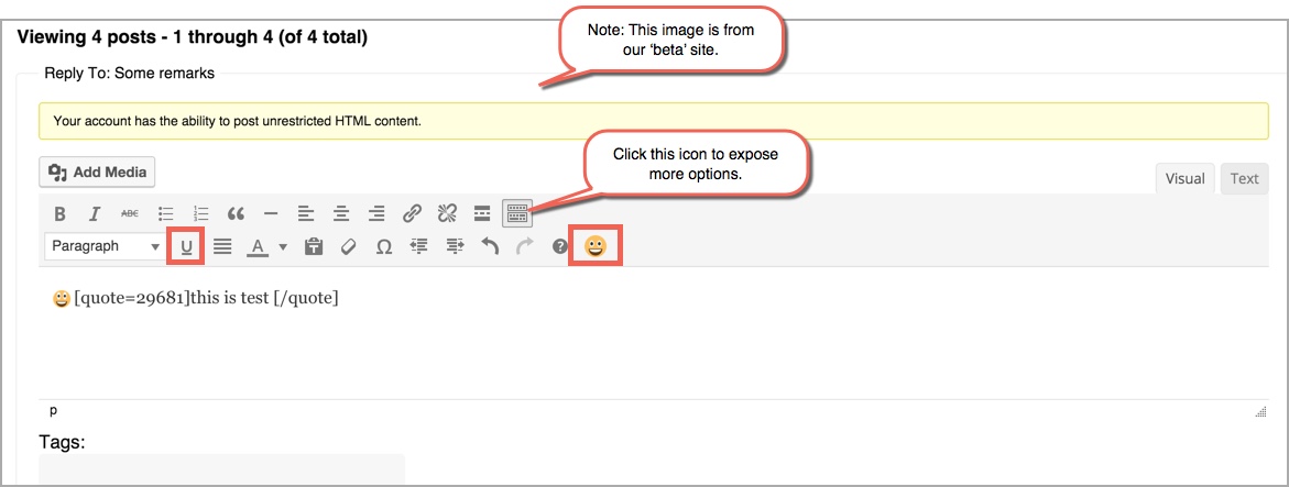 In the current site, it’s possible to get to the Underline option, but you have to click the ‘Toolbar Toggle’ icon to expose this option. I’ll see if we can bump it up to the top row so it’s not hidden; I would agree if anyone says it’s confusing, the way it is…