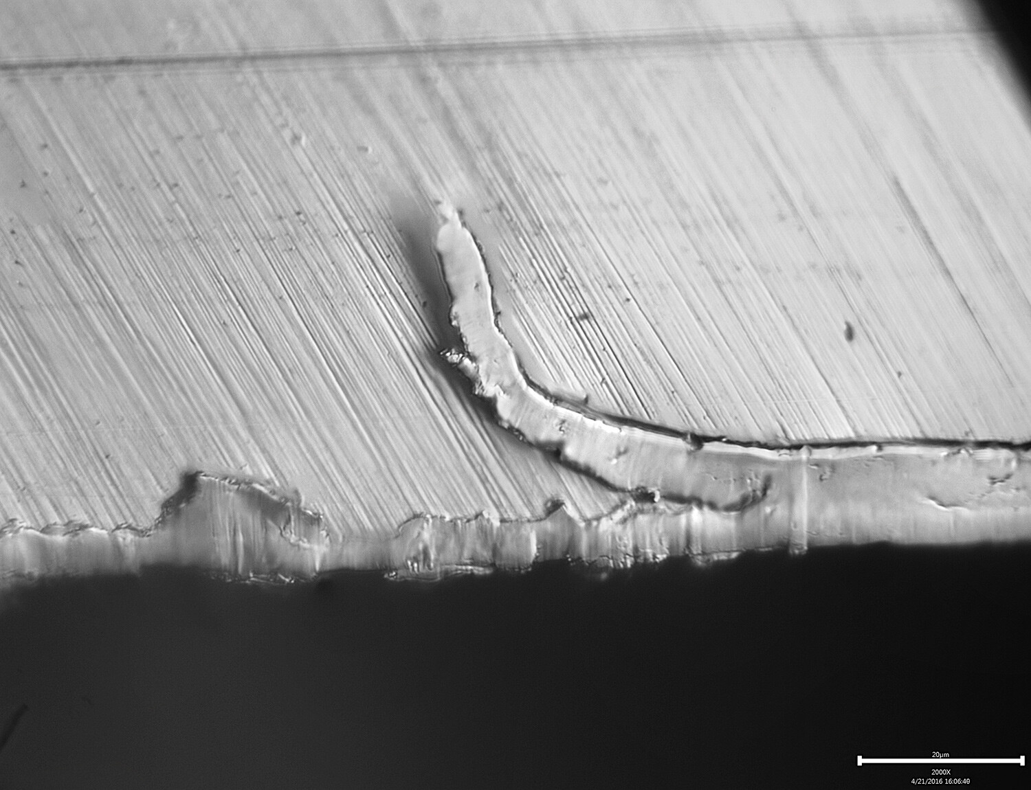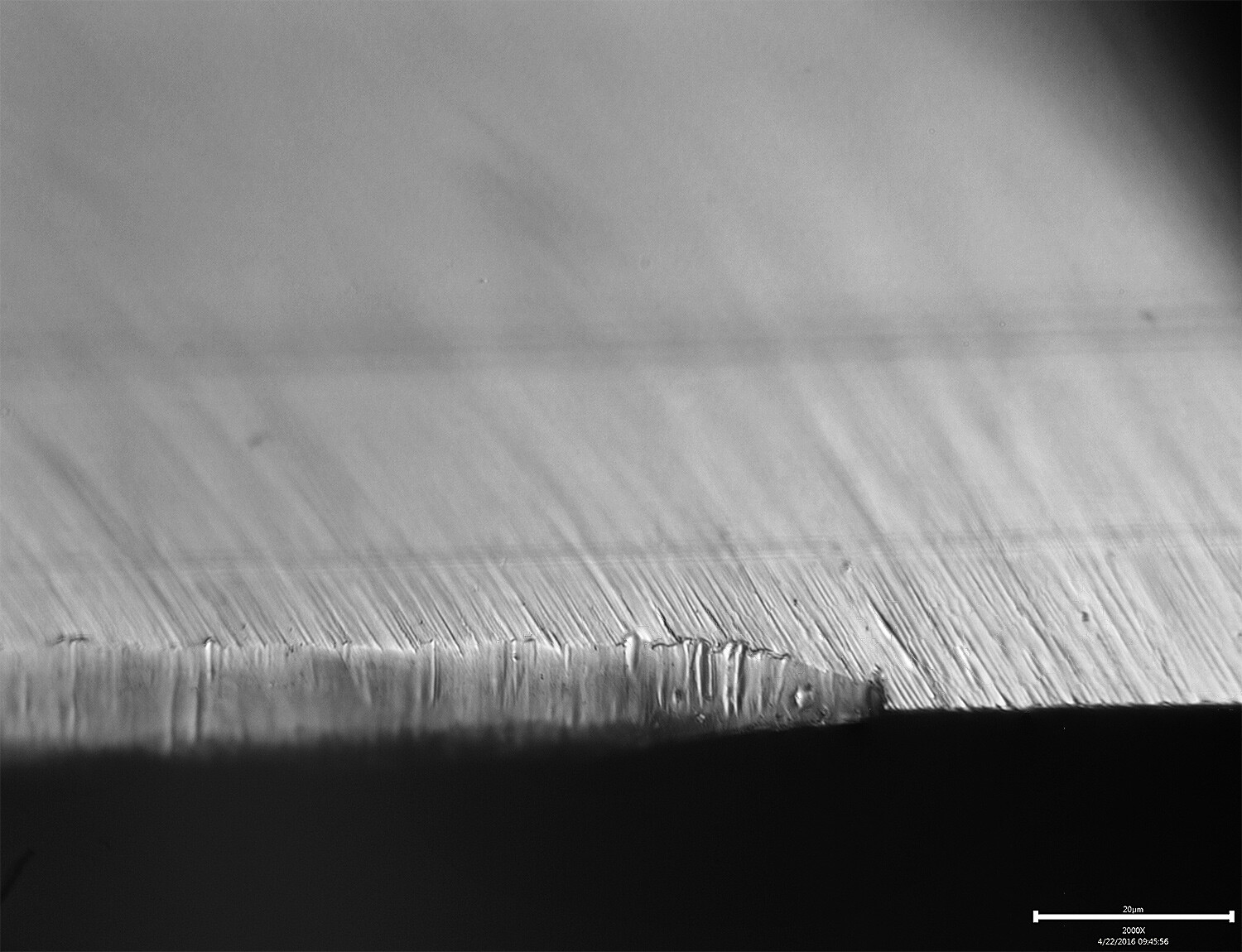 I put a blade I’d previously sharpened under the scope yesterday and got a big surprise. There was an enormous wire edge that had started to peel away from the rest of the material. This was a blade I’d imaged many times and had never detected the wire edge. I believe that why it suddenly showed up is that I had been trying to image straight down onto the edge and the various objective lenses I was using brushed back and forth across the edge as I was trying to find it in the scope. They must have pushed over the edge, which clearly turns out to have been very fragile. Check it out: