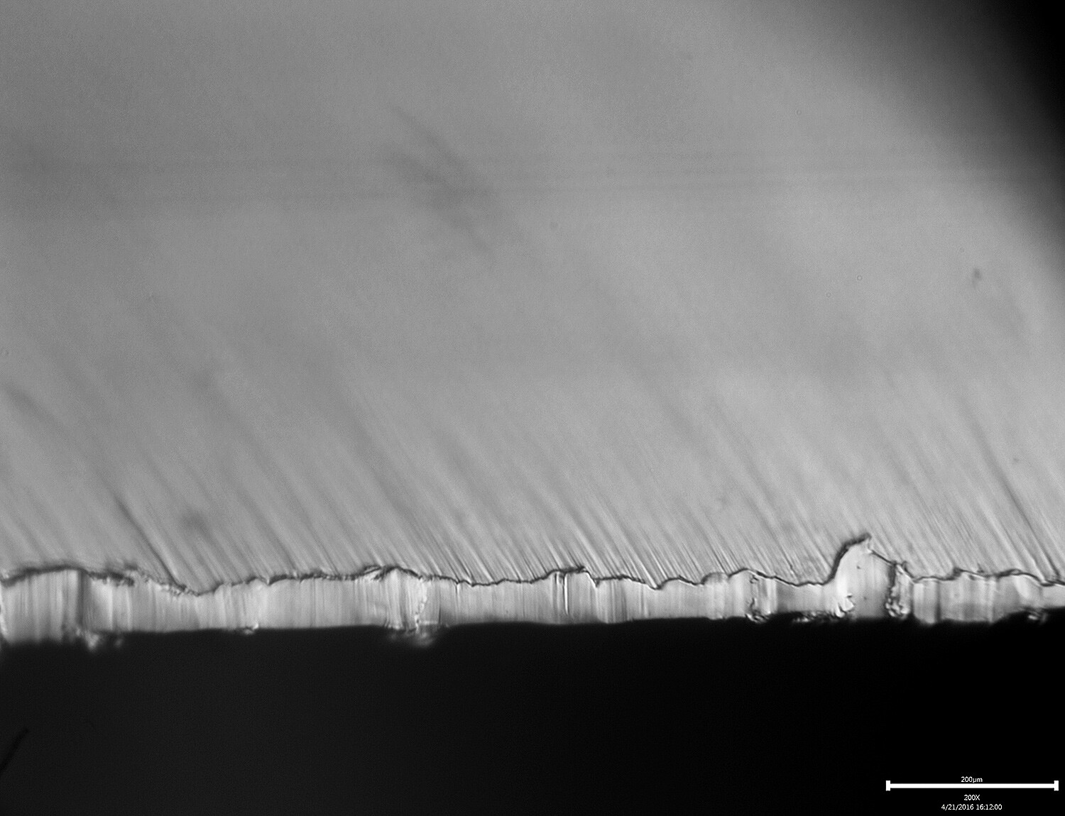 The chips missing from the edge in the 200x image are from where I knocked them loose to give myself a reference point to be able to find the same spot in the scope.